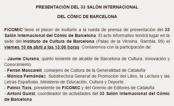 Mañana viernes 10 de abril, a las 13:00, tendrá lugar la rueda-presentación del 33è Saló del Còmic de Barcelona en el Instituto de Cultura de Barcelona (Palau de la Virreina - Rambla, 99) de Barcelona.